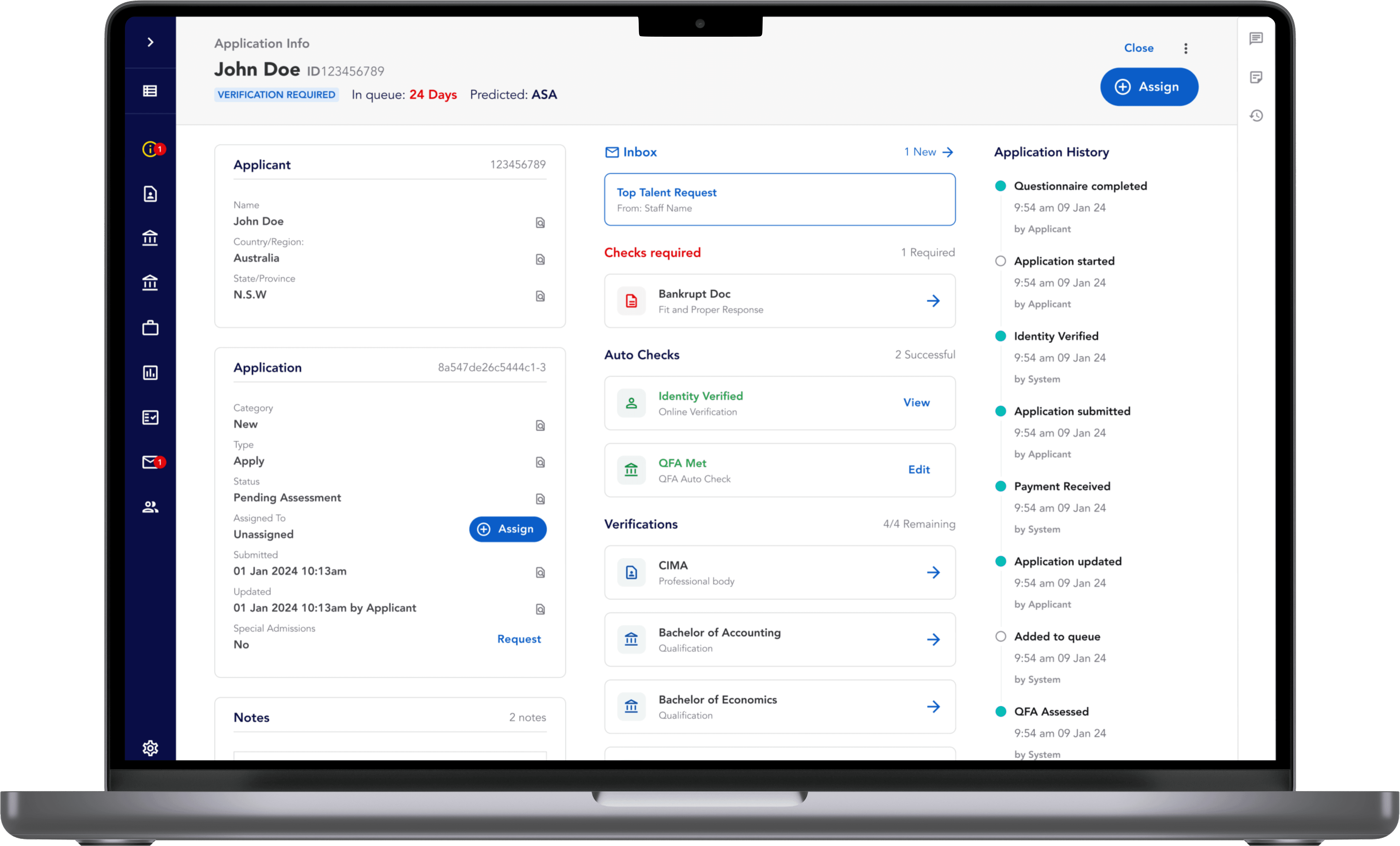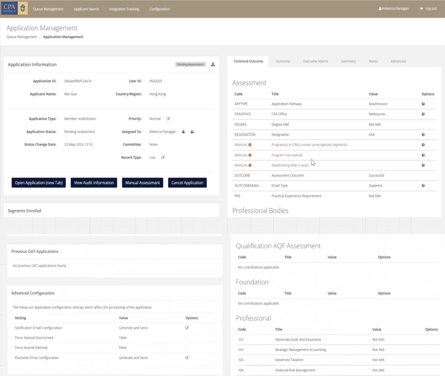 Single assessment view consolidating applicant data, documents, and status.