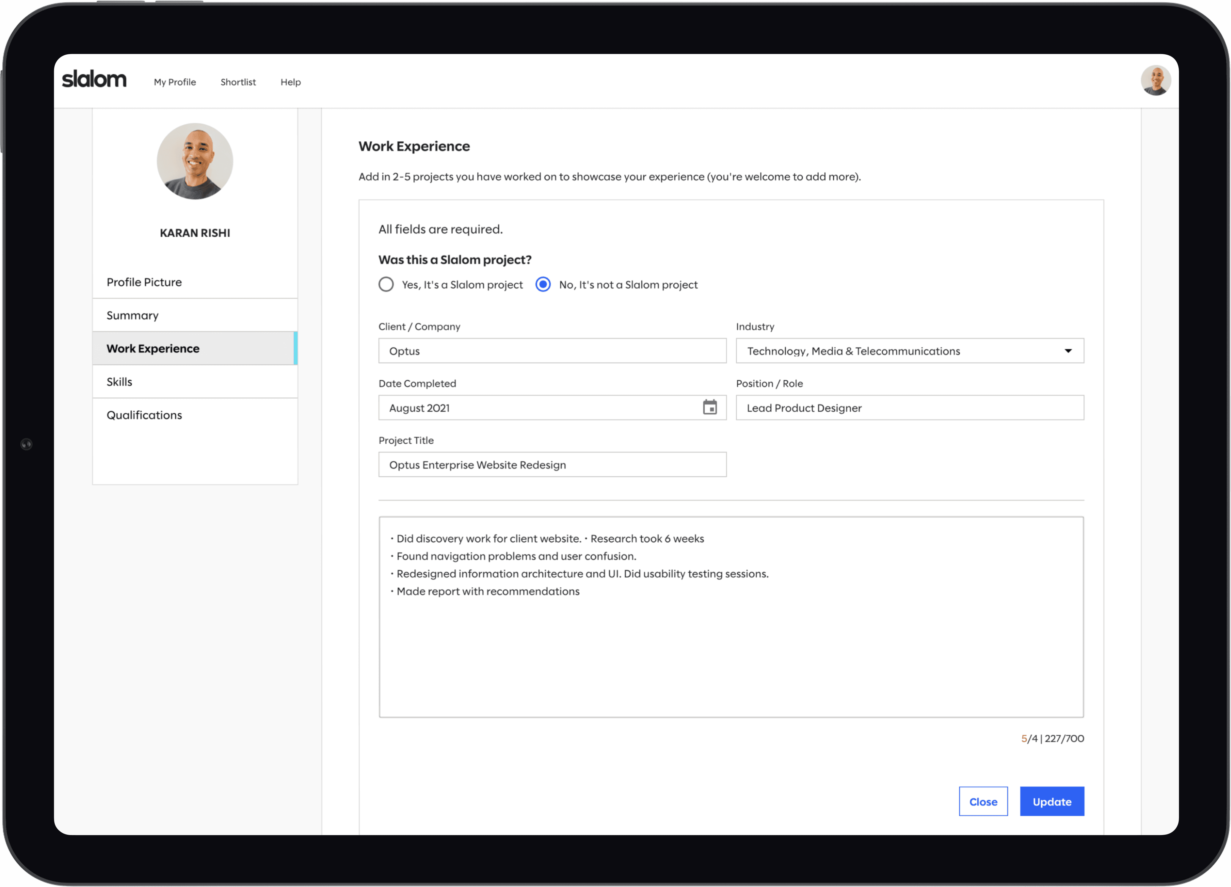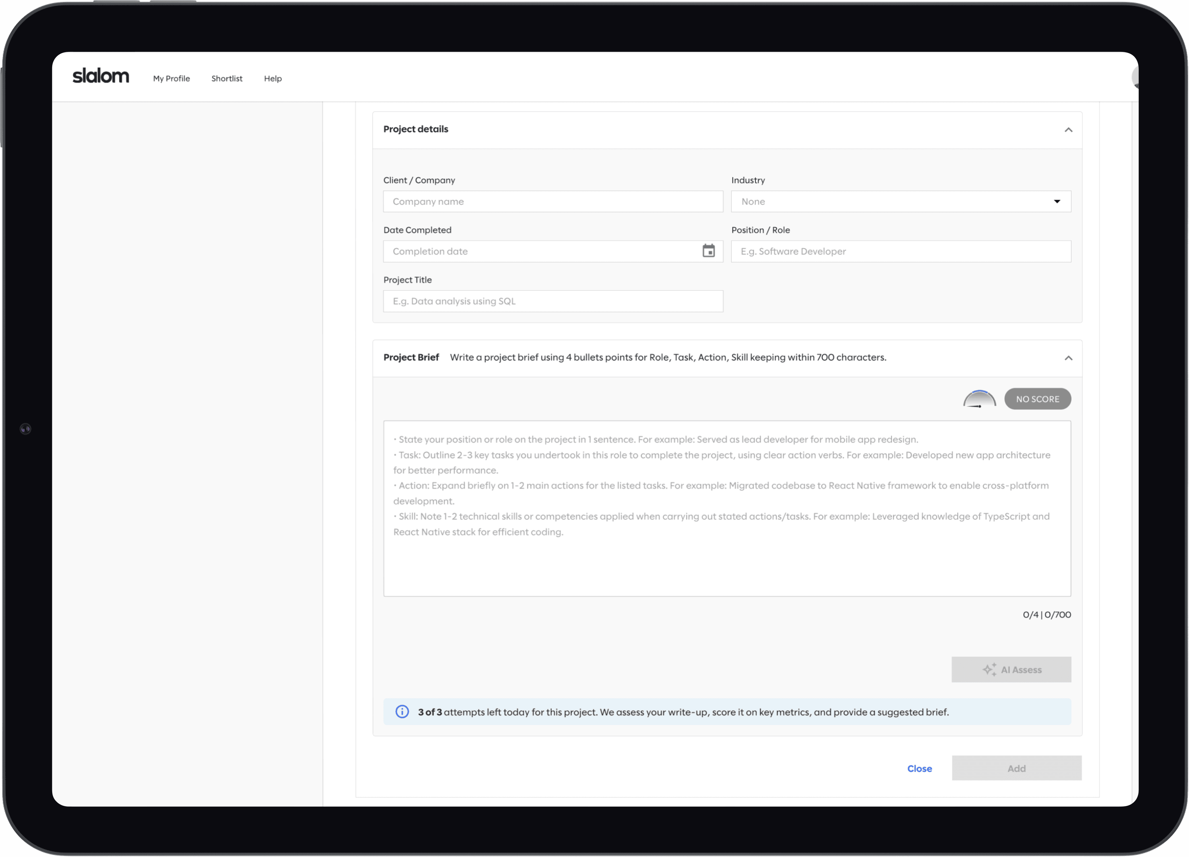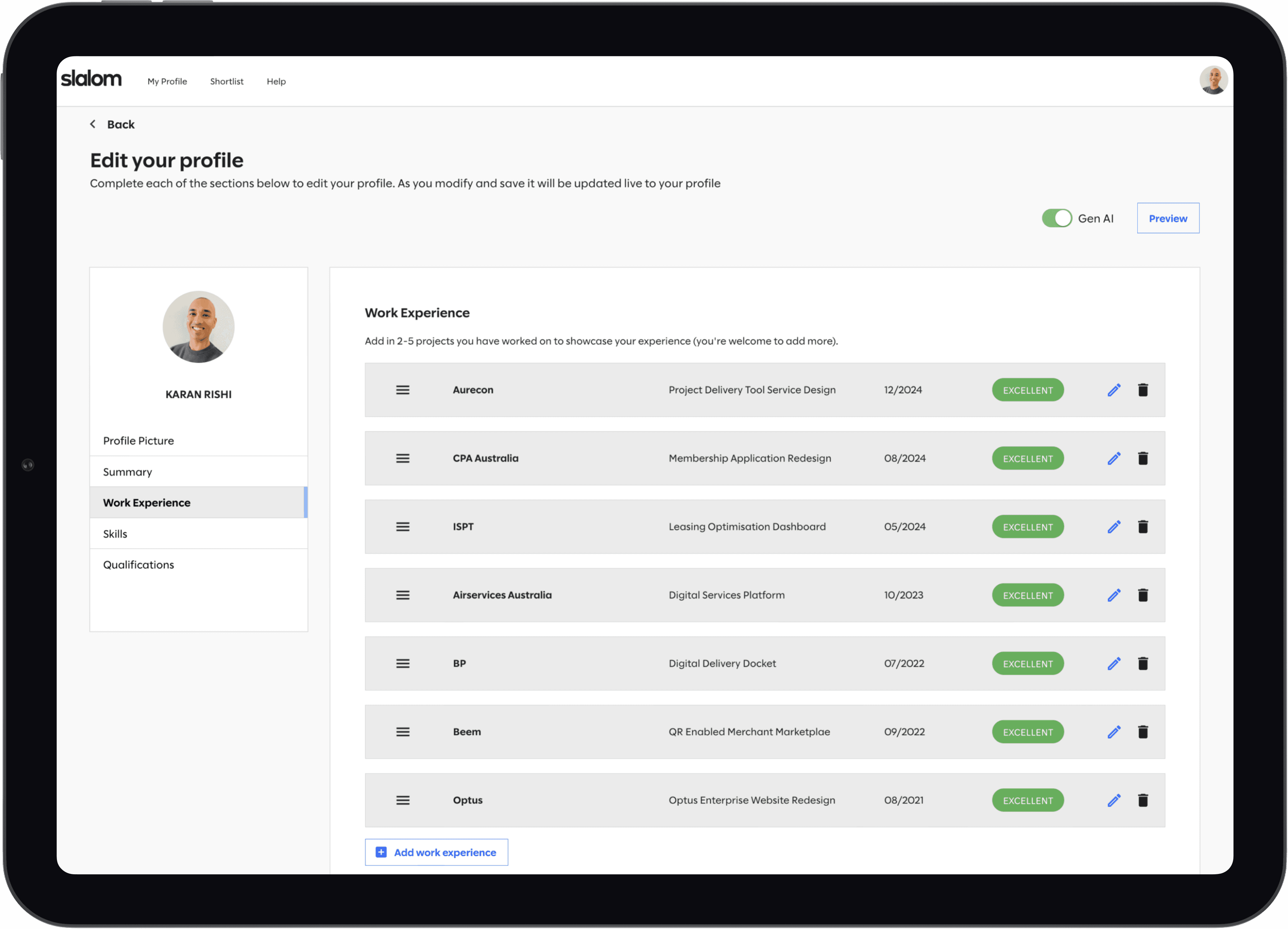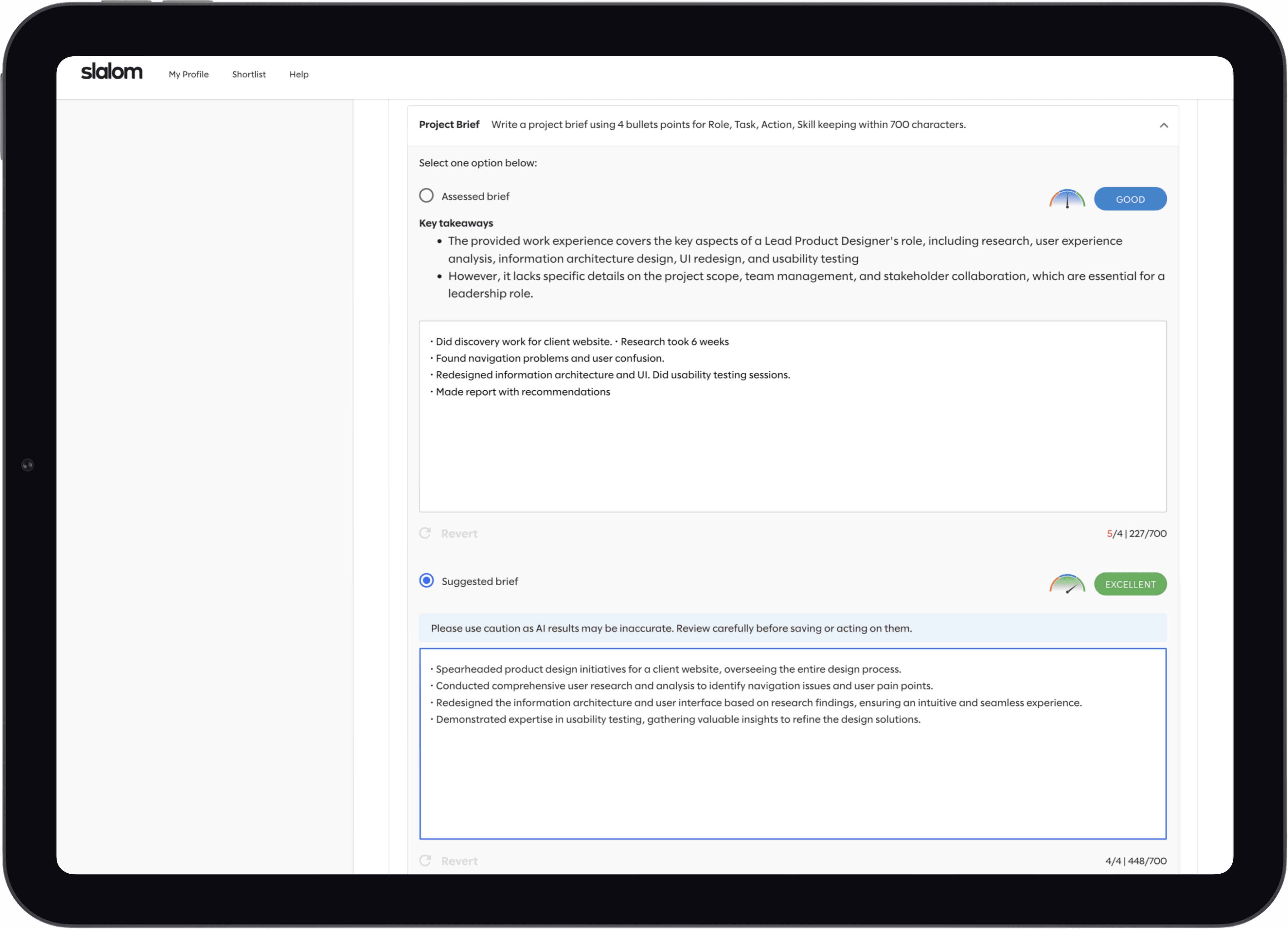 An AI-assisted workflow embedded directly into the existing Consultant hub that evaluates project descriptions, explains quality gaps, and generates improved, client-ready versions before profiles reach senior review.